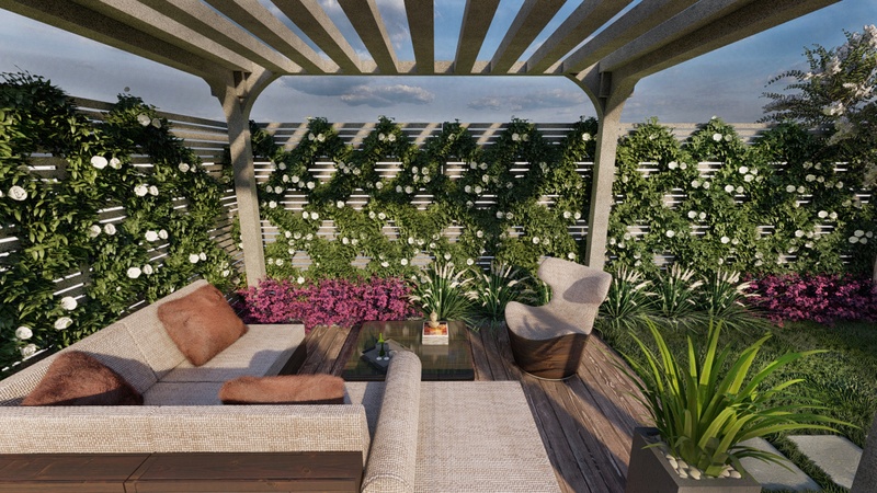 The main goal was to create a pleasant and modern space for outdoor relaxation. Planting design is simple and provides a comfortable and intimate atmosphere. The star of the show is a criss-cross vine wall with a native plant that has beautiful white blooms.